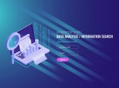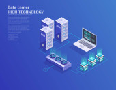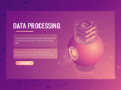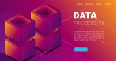 Koncepcja przetwarzania dużych zbiorów danych, baza danych w chmurze, wektor izometryczny, hosting stron internetowych i ikony serwerowni w ultrafiolecie