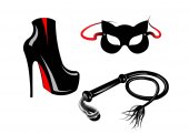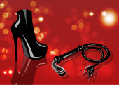 Fetysz i Zniewolenie rzeczy dla RPG i Bdsm: buty na obcasie, skórzany pejcz, na białym lub różowym tle rozmazany wektor