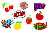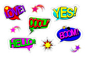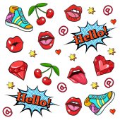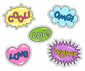 Zestaw patch komiks odznaki. Ręcznie rysowane wektor kreskówka śmieszne pop-art naklejki. Nowoczesne doodle szkic i napisy. Na białym tle na białym tle. Wektor
