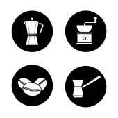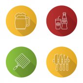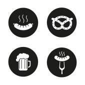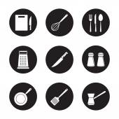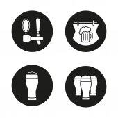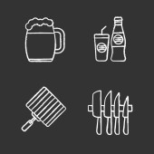 Zestaw ikon glifów do grillowania. BBQ. kufel, zimny napój, ręka grill, zestaw noży. Wektor białe sylwetki ilustracje w czarne koła