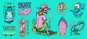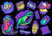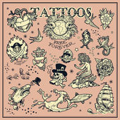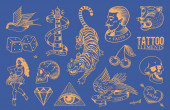 Zestaw łatek mody. Tatuażu dla dziewczyn. Tygrys i warg, czaszki i oko w trójkącie. Grawerowane ręcznie rysowane w stary szkic sztuka. Ilustracja wektorowa surrealistyczne, odznaki, nadruk na koszulki.