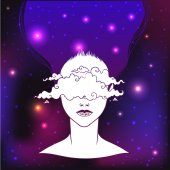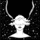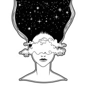 Piękna dziewczyna z chmury na jej twarzy. Kobieta portret albo noc bogini. Fantasy, duchowość, okultyzmu, tatuaż i modny wydruku. Ilustracja na białym tle wektor.