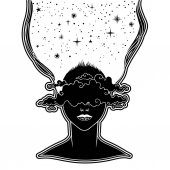Zdjęcie "Piękna dziewczyna z chmury na jej twarzy. Kobieta portret albo noc bogini. Fantasy, duchowość, okultyzmu, tatuaż i modny wydruku. Ilustracja na białym tle wektor." może być wykorzystywane do celów osobistych i komercyjnych zgodnie z warunkami zakupionej licencji Royalty-free. Obraz jest dostępny do pobrania w jakości wysokiej rozdzielczości do 5760x3840.