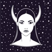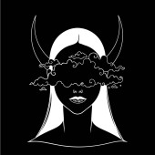 Piękna dziewczyna z koroną księżyca. Kobieta portret albo noc bogini. Ilustracja wektorowa na białym tle. Fantasy, duchowość, okultyzmu, tatuaż. Modny wydruku.