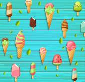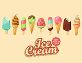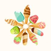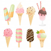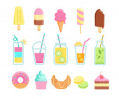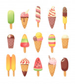 Nowa kolekcja kreskówka lód krem lato pyszne 2018 w płaski. 10 smaczne kolorowe desery lodowe, gelatos. Ilustracja wektorowa.