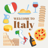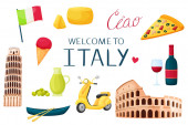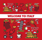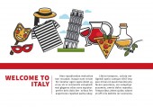 Witamy w Włochy plakat z symboli kraju wewnątrz serca. Elementy kultury, wyśmienite jedzenie i antyczny architektura na białym tle ilustracja kreskówka wektor płaskie na czerwonym tle.