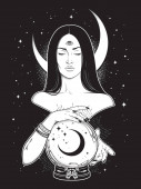 Ładna dziewczyna kąpieli w Pucharze z gwiazd i Księżyca w stylu ciemny tatuaż, wektor, ilustracja