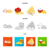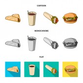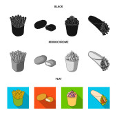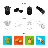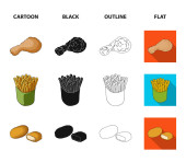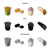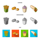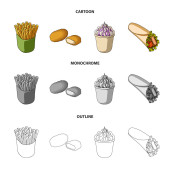 Żywności, napoje, przekąski i inne ikony www w kreskówce, zarys, płaski styl. Opakowania, papier, ziemniaki ikony w zestaw kolekcji.