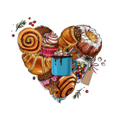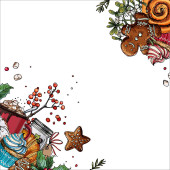 Boże Narodzenie wystrój, rośliny linię narysowaną na białym tle. Szkic jagody i liście. Jemioła, holly, kakao, herbatniki, Marmolada, cukierki, słodycze