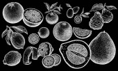 Orzech laskowy, orzech, orzeszki ziemne, migdałów, nerkowca, pistacjowy, orzech brazylijski, nasiona słonecznika i realistyczne nasiona dyni na białym tle. Ilustracja wektorowa. Grawerowanie Vintage art. Do rysowania ręcznego. Czarno-białe.