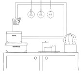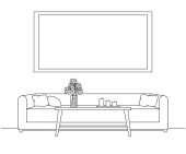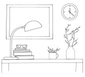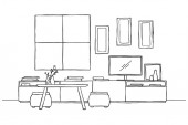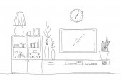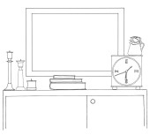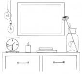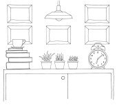 Szkic wnętrza. Stół, stolik, półkę z różnych elementów wnętrza. Może służyć jako mock up. Ramki dla grafiki.