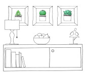 Szkic wnętrza. Stół, stolik, półkę z różnych elementów wnętrza. Może służyć jako mock up. Ramki dla grafiki.