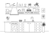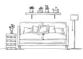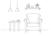 Szkic wnętrza. Stół, stolik, półkę z różnych elementów wnętrza. Może służyć jako mock up. Ramki dla grafiki.