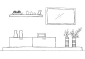 Szkic wnętrza. Stół, stolik, półkę z różnych elementów wnętrza. Może służyć jako mock up. Ramki dla grafiki.