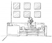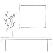 Szkic wnętrza. Stół, stolik, półkę z różnych elementów wnętrza. Może służyć jako mock up. Ramki dla grafiki.