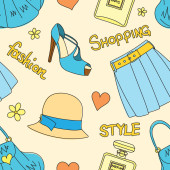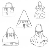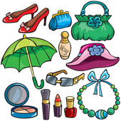 Zestaw torba, spódnica, buty, kapelusz i perfumy butelka na białym tle. Ilustracja wektorowa