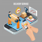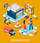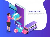 Koncepcja online dostawy z ilustrację chłopiec dostawy przekazania przesyłki do klienta.