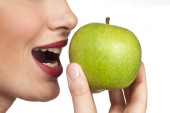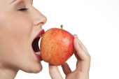 109 kobiet gryzący w zbliżenie świeży jabłko na białym tle