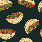 Burger, Cola Cup ze słomką, frytki, Ketchup, Falafel Pita lub Meatball Salad w sosie majonezowym kieszonkowym. Fast Street Food bez szwu. Realistyczna ilustracja narysowana ręcznie. Styl Doodle Savoyar