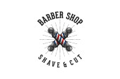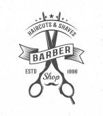 Fryzjer, sklep vintage etykiety, odznaka lub godło maszynką nożyczki i włosy na szarym tle. Fryzury i goli. Ilustracja wektorowa