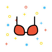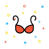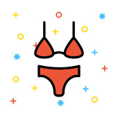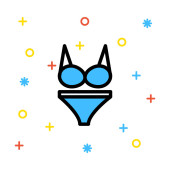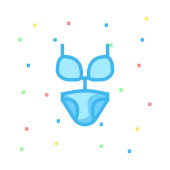 Niebieski strój kąpielowy na białym tle z kolorowymi symbolami