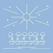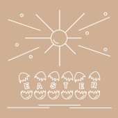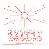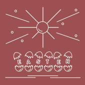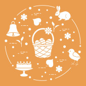 Symbole wielkanocne. Simmel cake, Kosz, jaja, dzwon, królik, pisklę, kwiaty, kiełki, liści.