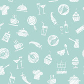 Żywności, wzór, niebieski, kontur, spożywczy, wektor. Jedzenie i napoje, produkcja i sprzedaż. Tło wektor. Biała linia ikon na niebieskim polu.