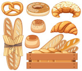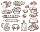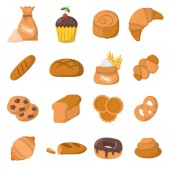 Chleb akwarela ikonę produktu spożywczego pszenicy. Bochenek, żyta i pszenicy chleb, francuskiej bagietki i rogalik, ciasto, ciastko i toast, cookie, bun i bajgiel, mąka torba, baker kapelusz i drewnianym wałkiem