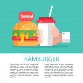 Fast food. Pyszne jedzenie. Ilustracja wektorowa w płaski. Zestaw naczyń popularny fast food. Hamburger, drinka, koktajl, francuski frytek, wiadro smażone udka.