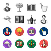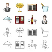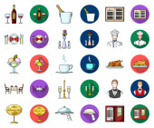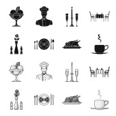 Wazon z kwiat, nakrycie stołu, smażony kurczak z dekoracji, filiżankę kawy. Restauracja zestaw kolekcji ikon w kreskówce, www ilustracji symbol wektor styl monochromatyczny.