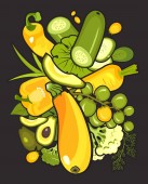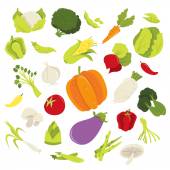 Ilustracja wektorowa zbiór dojrzałych warzyw zioła i owoce pokrojone plasterki na zestaw na białym tle