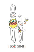 Ciesz się latem kartkę z życzeniami. Małe ptaki i pszczoły wybrać owoce, truskawki, czereśnie, gruszki i kwitnie. Ładna ręcznie rysowane postacie i elementy graficzne, ułożonych w koło na białym tle.