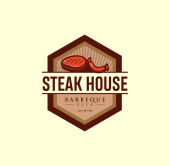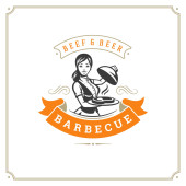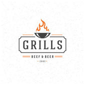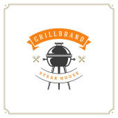 Grill restauracja logo wektor ilustracja. Barbecue steak house menu godło, kiełbasa z grilla na widelec sylwetka. Vintage Typografia odznaka projekt.