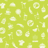 Żywności, wzór, zielony, kontur, spożywczy, wektor. Jedzenie i napoje, produkcja i sprzedaż. Tło wektor. Biała linia ikon na polu żółto zielony.