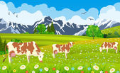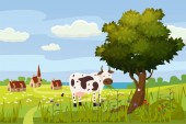 Krowa pasie się na łące trawa krajobraz, stylu Cartoon, wektor ilustracja jedzenie