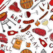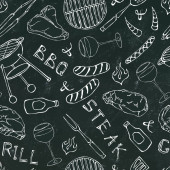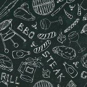 Płynny wzór letni grill Grill Party. Stek, kiełbasa, siatka na grilla, szczypce, widelec, ogień, keczup. Czarna tablica w tle i kreda. Ręcznie rysowana ilustracja wektora. Słodki styl Doodle