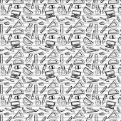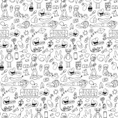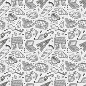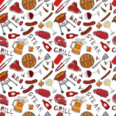Płynny wzór letni grill Grill Party. Stek, kiełbasa, siatka na grilla, szczypce, widelec, ogień, keczup. Ręcznie rysowana ilustracja wektora. Styl bazgrołów