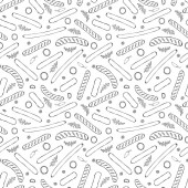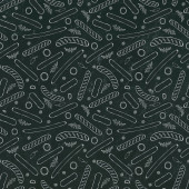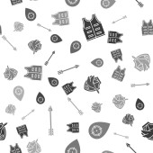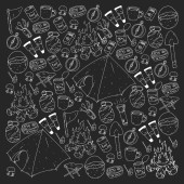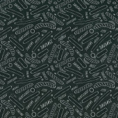 Płynny wzór letni grill Grill Party. Szklanka czerwonego, białego wina, steku, kiełbasy, grilla, szczypce, widelec. Czarna tablica w tle i kreda. Ręcznie rysowana ilustracja wektora. Styl bazgrołów
