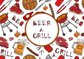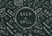 Płynny wzór letni grill Grill Party. Piwo, stek, kiełbasa, siatka na grilla, szczypce, widelec, ogień, keczup. Czarna tablica w tle i kreda. Ręcznie rysowana ilustracja wektora. Styl bazgrołów
