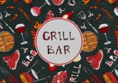 Płynny wzór letniego grilla i grilla. Stek, kiełbasa, siatka na grilla, szczypce, widelec, ogień, keczup. Czarna tablica w tle i kreda. Ręcznie rysowana ilustracja wektora. Styl bazgrołów