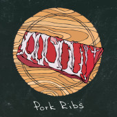 Żeberka jagnięce z ziołami, cytryną, pomidorem, pietruszką, tymiankiem, pieprzem. Na okrągłej desce do cięcia drewna. Przewodnik po mięsie dla Rzeźnika lub Steak House Restaurant Menu. Ręcznie narysowana ilustracja. Styl bazgrołów