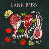 Zdjęcie "Targ mięsny. Kawałki mięsa - wołowina, wieprzowina, jagnięcina, stek, zgrzyt bez kości, pieczeń żeberkowa, polędwica i żeberka. Pomidor, Oliwki, papryka, cebula, zioła czosnku Widelec szczypce Black Board Tło i kreda" może być wykorzystywane do celów osobistych i komercyjnych zgodnie z warunkami zakupionej licencji Royalty-free. Obraz jest dostępny do pobrania w jakości wysokiej rozdzielczości do 5760x3840.