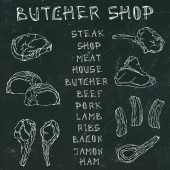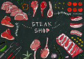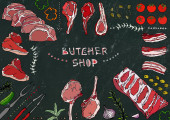 Sklep mięsny. Kawałki mięsa - wołowina, wieprzowina, jagnięcina, stek, zgrzyt bez kości, pieczeń żeberkowa, polędwica i żeberka. Pomidor, Oliwki, papryka, cebula, zioła czosnku Widelec szczypce Black Board Tło i kreda