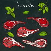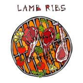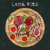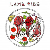 Żeberka jagnięce z ziołami, cytryną, pomidorem, pietruszką, tymiankiem, pieprzem. Na grillu z okrągłym grillem. Meat Steak House Restauracja Menu. Ręcznie narysowana ilustracja. Styl bazgrołów. Czarna plansza tle i kreda