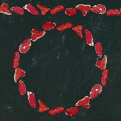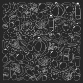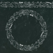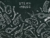 Kawałki mięsa - wołowina, wieprzowina, jagnięcina, stek, zgrzyt bez kości, pieczeń żeberkowa, polędwica i żeberka. Pomidor, Oliwki, papryka, cebula, kapary, czosnek Zioła widelec szczypce Black Board Tło i kreda