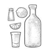Szkło, butelki, solą i limonką. Tequila napis kaligraficznego pisma ręcznego. Vintage wektor czarny Grawerowanie ilustracja etykiety, plakat. Na białym tle