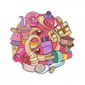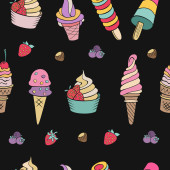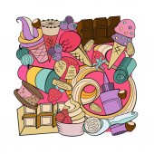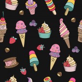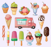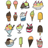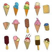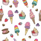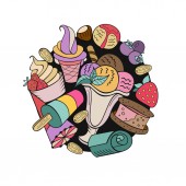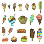 Ręcznie rysowane lody. Miscellaneous lody z polewa, orzechy, jagody, czekolady i ciastek. Ilustracja wektorowa Doodle.