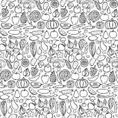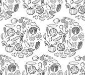 Warzywa bez szwu wzór z ogórków, czerwone pomidory, papryka, burak, marchew, cebula, czosnek, chili, dynia. Świeża sałatka. Zdrowe wegetariańskie jedzenie. Ręcznie narysowana ilustracja. Styl bazgrołów