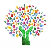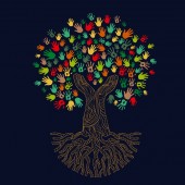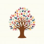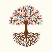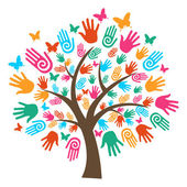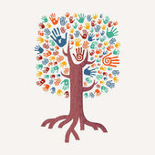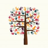 Drzewo kolorowy ludzkimi rękoma razem. Ilustracja koncepcja zespołu Wspólnoty kultury różnorodności, charakter projektu opieka lub pracy zespołowej. Eps10 wektor.