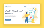 Car-sharing szablon strony sieci web usługi reklamowe. Człowiek z smartphone stojący w pobliżu samochodu. Strona docelowa nowoczesnych aplikacji mobilnej z kolorowych ilustracji. Koncepcja biznesowa Strona internetowa. EPS 10.